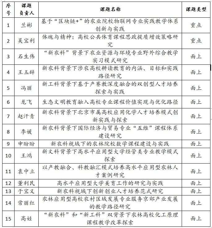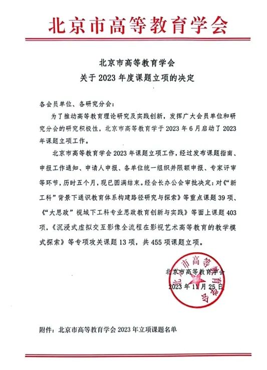 根据《北京市高等教育学会关于2023年度课题立项的决定》,永利3044官网唯一共获批15项课题立项,其中重点课题2项、面上课题13项,具体信息如下: