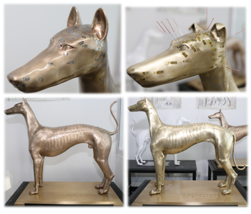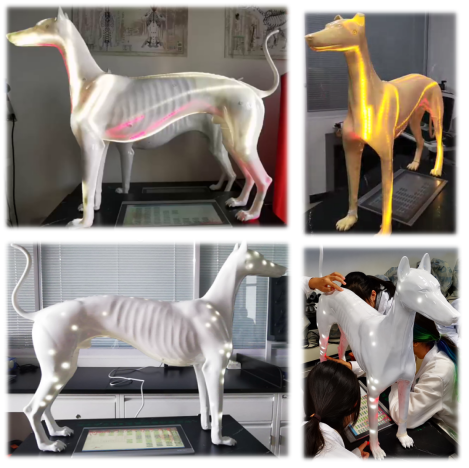 模型独特外观,突显用于腧穴定位的百余处体表标志,可辅助腧穴快速准确定位:犬腧穴定位模型体型较小,方便携带,适合随时随地练习;犬智能经络腧穴模型动态演示十四经脉在体表循行流域和走向,对参照体表标志的准确点穴进行智能声光应答、语音讲解与专业知识呈现;针灸铜犬体表约700穴孔,可依据体表标志揣摩腧穴位置,练习针刺操作,以多色材料填充腧穴,通过颜色了解经脉循行和腧穴分布特点。